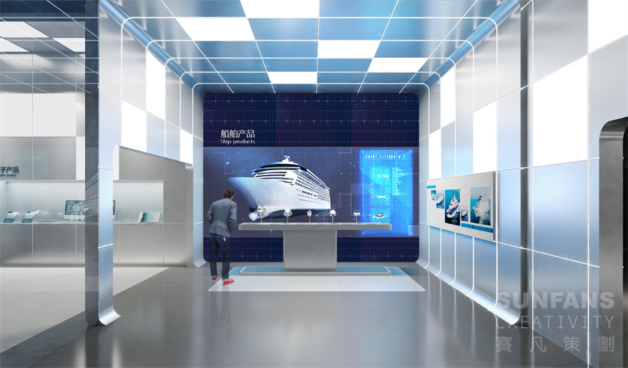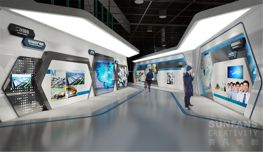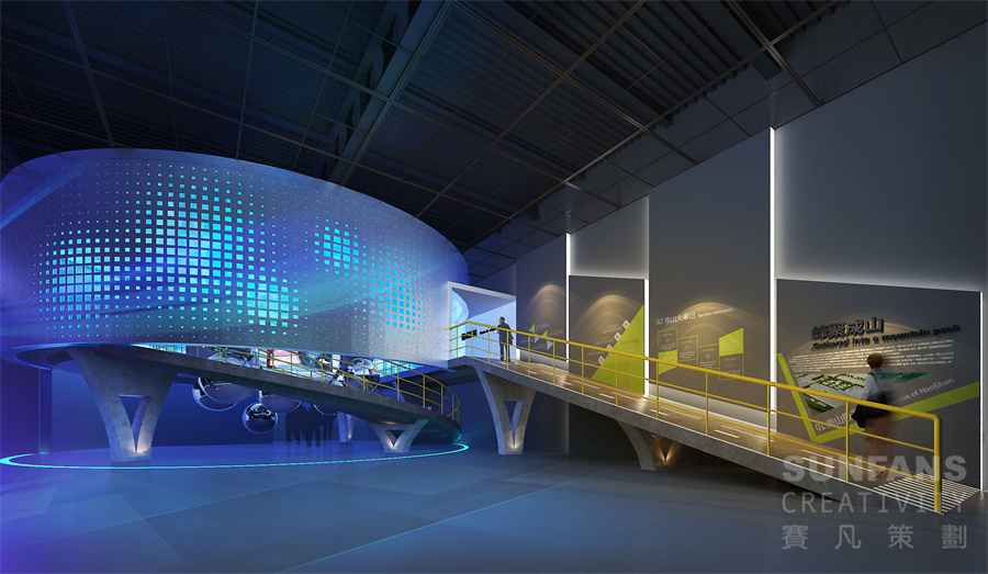 展館以“鋁行”為題,從飛機(jī)、高鐵、軌道交通輪廓中抽取重合曲線,底部輔以城市天際線,表達(dá)“南山鋁業(yè)改變世界”的理念,振興民族工業(yè)的使命夢想。