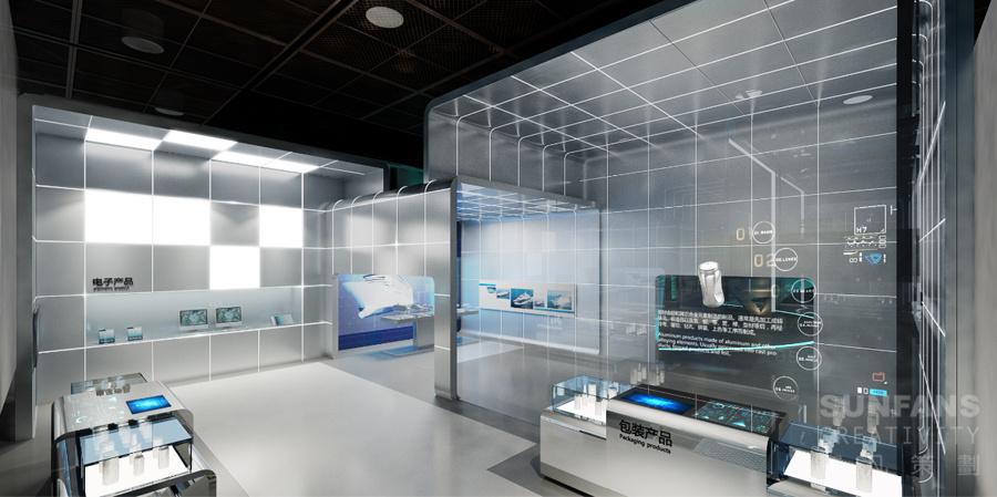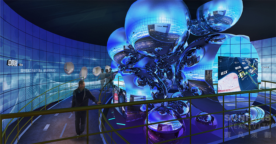 以“三維分子結(jié)構(gòu)”為創(chuàng)意來源,分子與分子的鏈接,恰如鋁業(yè)生產(chǎn)鏈中一環(huán)扣一環(huán),產(chǎn)生集聚效應(yīng)。將分子剖切形成多組看面,從鋁土礦到電解鋁,從鍛造到中厚板,以視頻展示每個環(huán)節(jié)的工藝流程。