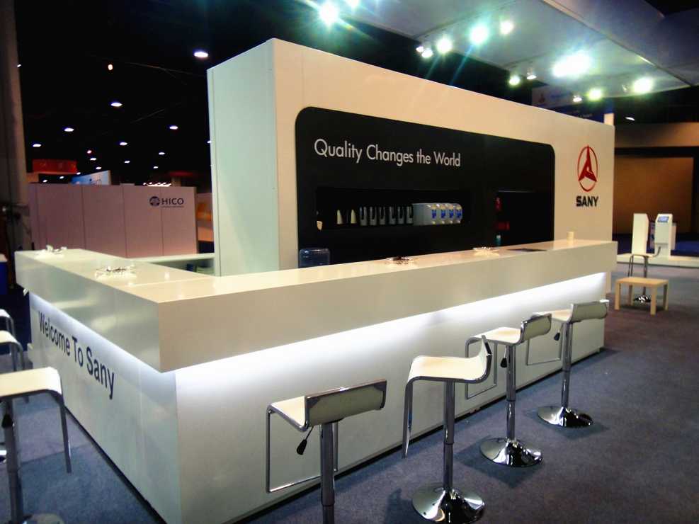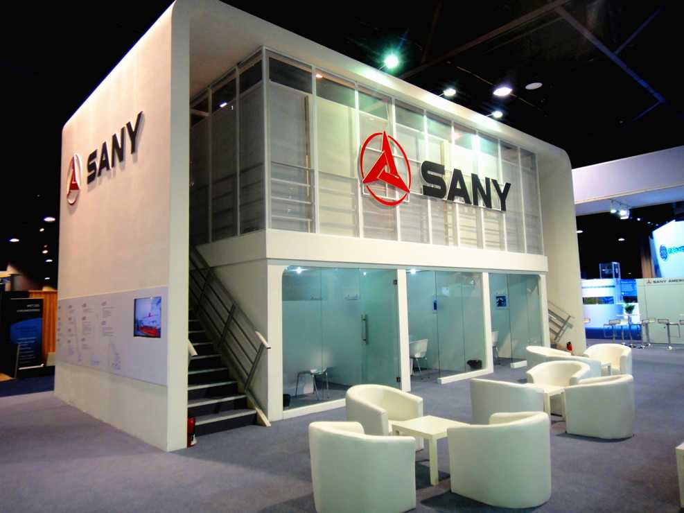 在本案中,賽凡使用了偏暖白的顏色進(jìn)行主體設(shè)計(jì),地面鋪設(shè)灰色地毯,暖白與灰色的結(jié)合是一冷一暖的融合,色彩的碰撞激發(fā)出更加具有藝術(shù)的氛圍。整個(gè)設(shè)計(jì)與國(guó)際接軌,獨(dú)棟的二層獨(dú)立展示臺(tái)與樓宇無(wú)異,可以讓人更容易注意到SANY的展臺(tái)。在展臺(tái)外側(cè),放置現(xiàn)代化的沙發(fā)型座椅,方形的的小型洽談桌讓整體風(fēng)格更加偏北美風(fēng)格,融入其中。在獨(dú)立的樓層兩側(cè)與正面,賽凡都將品牌的LOGO進(jìn)行展示。一層為三個(gè)獨(dú)立的私密會(huì)議室,方便客戶(hù)進(jìn)行更進(jìn)一步的商務(wù)洽談。通往二層的樓梯采用鐵藝,彰顯出外放的企業(yè)特點(diǎn)。