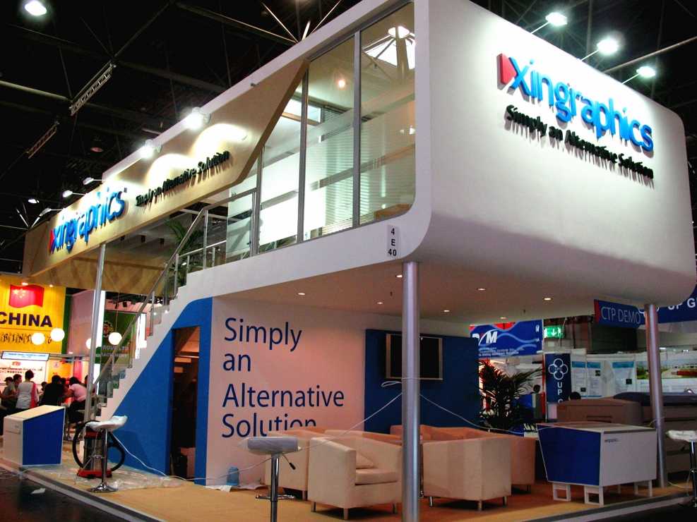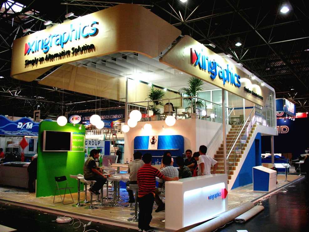 展臺(tái)中央放置洽談桌作為業(yè)務(wù)商討,背部綠色的隔斷墻上掛小型LED屏幕,方便視頻宣傳,保證企業(yè)的傳播效果。雙層的的結(jié)構(gòu)頂部為黃色原木材質(zhì),舒緩的顏色營(yíng)造更加適宜的瀏覽環(huán)境。在側(cè)面使用同種顏色的樓梯,探出行的結(jié)構(gòu)在裝置照明設(shè)備的同時(shí),也成為一個(gè)亮眼的造型裝飾。