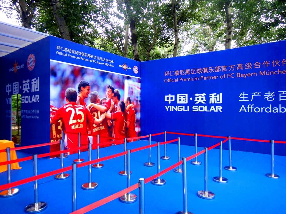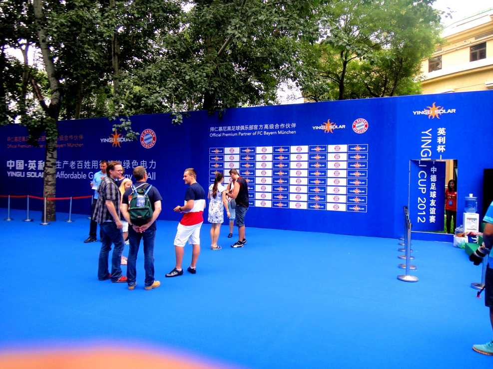 在北京,拜仁除了進(jìn)行友誼賽等足球活動(dòng),還參加了中國(guó)·英利的杯足球友誼賽足球嘉年華活動(dòng)。在本場(chǎng)地的布置上,選用了大面積的藍(lán)色地毯進(jìn)行鋪設(shè),四周使用相同顏色的藍(lán)色擋板用于背景板的使用。主舞臺(tái)采用了淺綠色的色調(diào),藍(lán)色與綠色的結(jié)合,象征著足球積極向上的拼搏精神,競(jìng)技精神。綠色也讓到訪的球員更有親切感,更好的融入中國(guó)。
