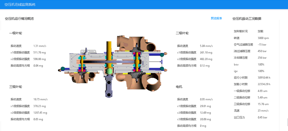 The air compressor fault prediction solution uses the Internet of things high-frequency vibration sensor to collect the equipment vibration waveform samples and surface temperature, and generate the vibration characteristic samples of the air compressor equipment; The edge computing gateway collects the three-phase winding temperature and lubricating oil temperature of the air compressor through the platinum resistance to understand the operating load state of the air compressor. Combined with the vibration characteristics of the sensor, the intelligent mechanism model algorithm is used to analyze the big data of the sampled data, so as to realize the prediction of air compressor equipment faults such as imbalance, misalignment, looseness, gear wear and bearing aging; Then upload the data samples and analysis learning results to the witcloud Internet of things data cloud platform through mqtt; The SaaS business cloud platform of the solution provides users with status monitoring, scene monitoring, fault management, operation and maintenance management, equipment management, customer management, authority management and other functions; It also provides data interface function to facilitate users to import equipment status into intelligent factory operation and maintenance platform system. At the same time, the business cloud platform provides professional users with operation status analysis and early warning fault analysis of air compressor equipment through big data analysis tools, and forms professional air compressor equipment health diagnosis reports and maintenance suggestions.