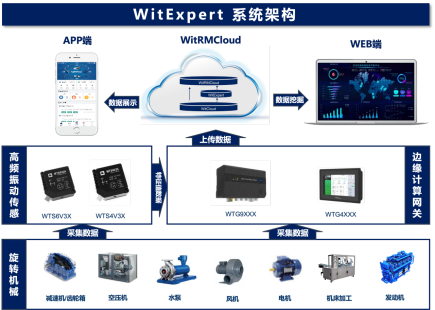 上海輝度/上海輝泰Witium,依托專注于工業(yè)物聯(lián)網(wǎng)+人工智能(工業(yè)AIoT)領(lǐng)域,十年深耕技術(shù)、服務(wù)全球客戶的沉淀,成功研發(fā)出基于機(jī)理及大數(shù)據(jù)數(shù)理模型的設(shè)備預(yù)測(cè)性維護(hù)解決方案 -- WitExpert。WitExpert的系統(tǒng)架構(gòu)大致如下。常見的旋轉(zhuǎn)機(jī)械包括電機(jī)、減速機(jī)、空壓機(jī)、水泵、風(fēng)機(jī)等等,通過在靠近設(shè)備振動(dòng)源的位置安裝溫振傳感器的方式,采集設(shè)備的振動(dòng)與溫度數(shù)據(jù),將特征值數(shù)據(jù)傳輸?shù)轿覀兊倪吘売?jì)算網(wǎng)關(guān),再通過網(wǎng)關(guān)把數(shù)據(jù)上傳至我們的WitCloud平臺(tái),用戶就可以通過Web端與App端看到設(shè)備的故障預(yù)測(cè)及相關(guān)健康信息。