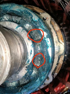2022年11月3日,拆解電機(jī),檢查驅(qū)動(dòng)端軸承,發(fā)現(xiàn)軸承內(nèi)部潤(rùn)滑脂存在碳化表現(xiàn)(見圖5),由于缺少軸承備件,未進(jìn)行更換,清洗舊潤(rùn)滑脂后加注新潤(rùn)滑脂。