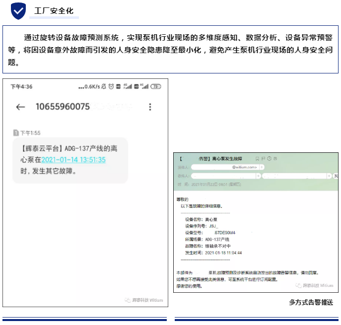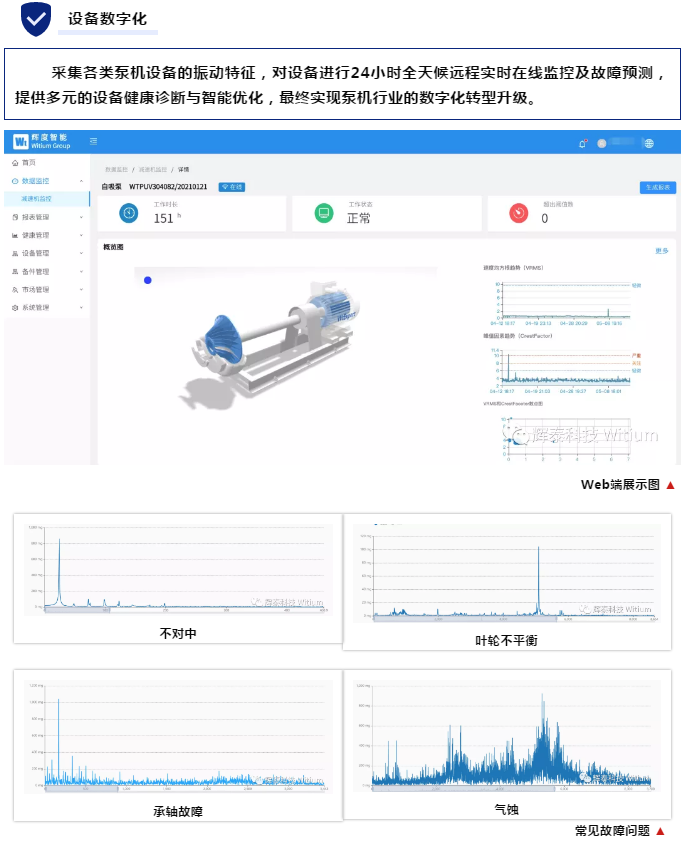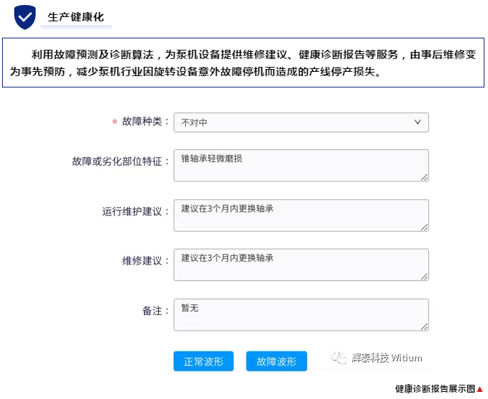 通過WTG9XXX邊緣計算網(wǎng)關(guān)對數(shù)據(jù)進行分析,并把振動數(shù)據(jù)上傳到WitCloud物聯(lián)網(wǎng)數(shù)據(jù)云平臺,利用WitExpert上的特性樣本庫結(jié)合智能算法對數(shù)據(jù)進行機器學習,生成對應(yīng)的故障預(yù)測模型,該模型根據(jù)實時采集的振動數(shù)據(jù),最終反饋到WitRMSaaS用戶平臺,為用戶提供泵機現(xiàn)場相關(guān)設(shè)備的在線監(jiān)控、故障分析、維修建議、健康診斷報告等服務(wù)。