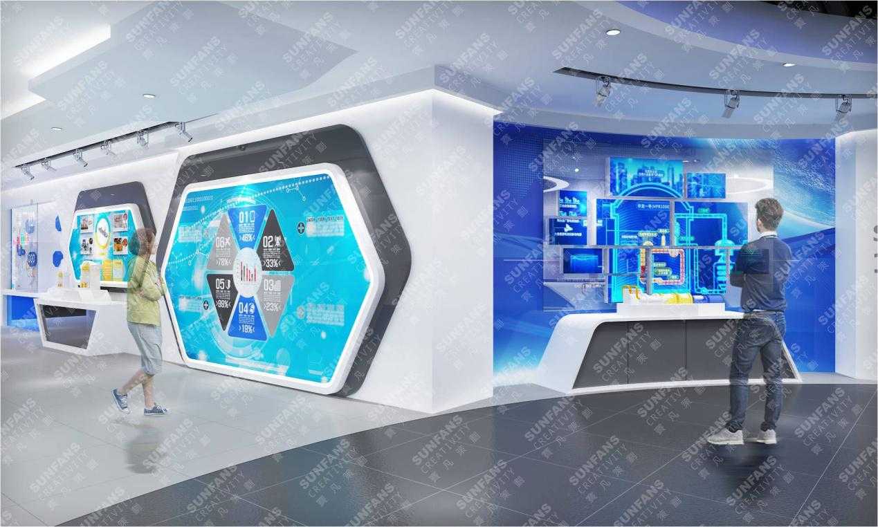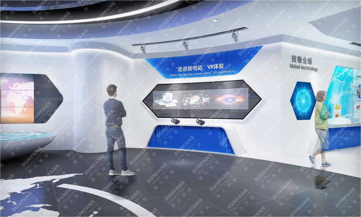 在空間色彩風(fēng)格設(shè)計(jì)上,以藍(lán)、白主調(diào)形成國際化、科技感的簡約格調(diào),通過運(yùn)用提煉安全核等元素,利用折形的墻面造型營造工業(yè)感,打造中核建專屬展廳,植入更為先進(jìn)的展示手段,以精致的品質(zhì)感,融入VR互動(dòng),三位一體沙盤等科技展項(xiàng)。