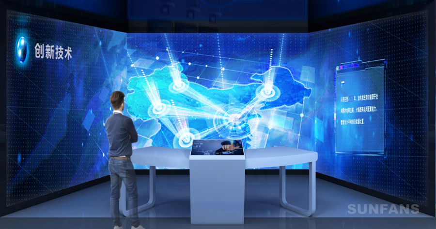 應(yīng)用了高流明投影和觸控傳感技術(shù),將普通墻面變身為光影交互的“魔法墻”。魔法墻支持多人同時(shí)操作,用戶可通過(guò)雙手觸碰墻面和輕掃來(lái)觸發(fā)電網(wǎng)發(fā)、輸、變、配、營(yíng)銷、運(yùn)檢、物資管理等關(guān)鍵環(huán)節(jié)進(jìn)行詳細(xì)展示。魔法墻展示具有易更換的特點(diǎn),方便內(nèi)容的擴(kuò)充。