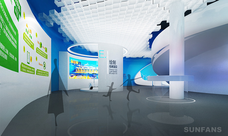 數(shù)字展廳頂棚空間具有可變性,應(yīng)該利用這一特性在合適的局部創(chuàng)造出各種富有變化的空間造型組成要素。頂棚展臺(tái)搭建材料的運(yùn)用應(yīng)該盡量在同一層,以一到兩種為主在統(tǒng)一中求變化。另外,賽凡策劃設(shè)計(jì)師在數(shù)字展廳設(shè)計(jì)時(shí)除要考慮其本身材料的屬性、造型、色彩特性,還要考慮打具的設(shè)計(jì)和布置與藝術(shù)效果的關(guān)系;還要注意以恰當(dāng)?shù)某叨群蜆?gòu)圖方式等進(jìn)行美化。