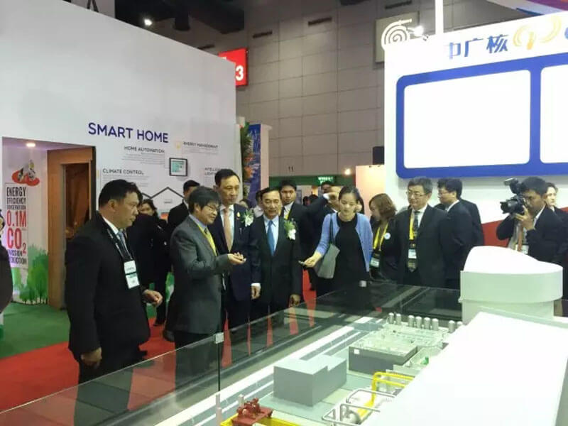 在中廣核展臺,胡文泉向泰國能源部長AnantapornKanchanarat介紹了中廣核在核電、風電、太陽能等清潔能源業(yè)務的發(fā)展情況和中廣核的全球化市場推廣情況,當?shù)弥袕V核不僅有核電還有其他風電等清潔能源時,他產(chǎn)生了濃厚的興趣。他還主動問起了此前泰國RATCH電力公司參股建設的防城港核電二期項目,詢問了項目的詳細地理位置和項目進展,胡文泉邀請他到防城港項目參觀,他爽快地點頭答應。在中國自主三代核電技術“華龍一號”的技術模型前,部長詳細詢問了華龍一號的技術特征和國際市場推廣情況,并表示歡迎中廣核今后能更深度地參與泰國市場的清潔能源合作。