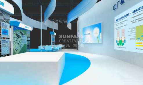 配合本次展覽“科技創(chuàng)新、合作共贏、安全發(fā)展”的主題,以及此次中廣核以ACPR1000核電技術(shù)模型為核心的展示要求,以海浪為主要元素,搭配充滿科技感的藍色,彰顯此次展覽科技創(chuàng)新的主題。