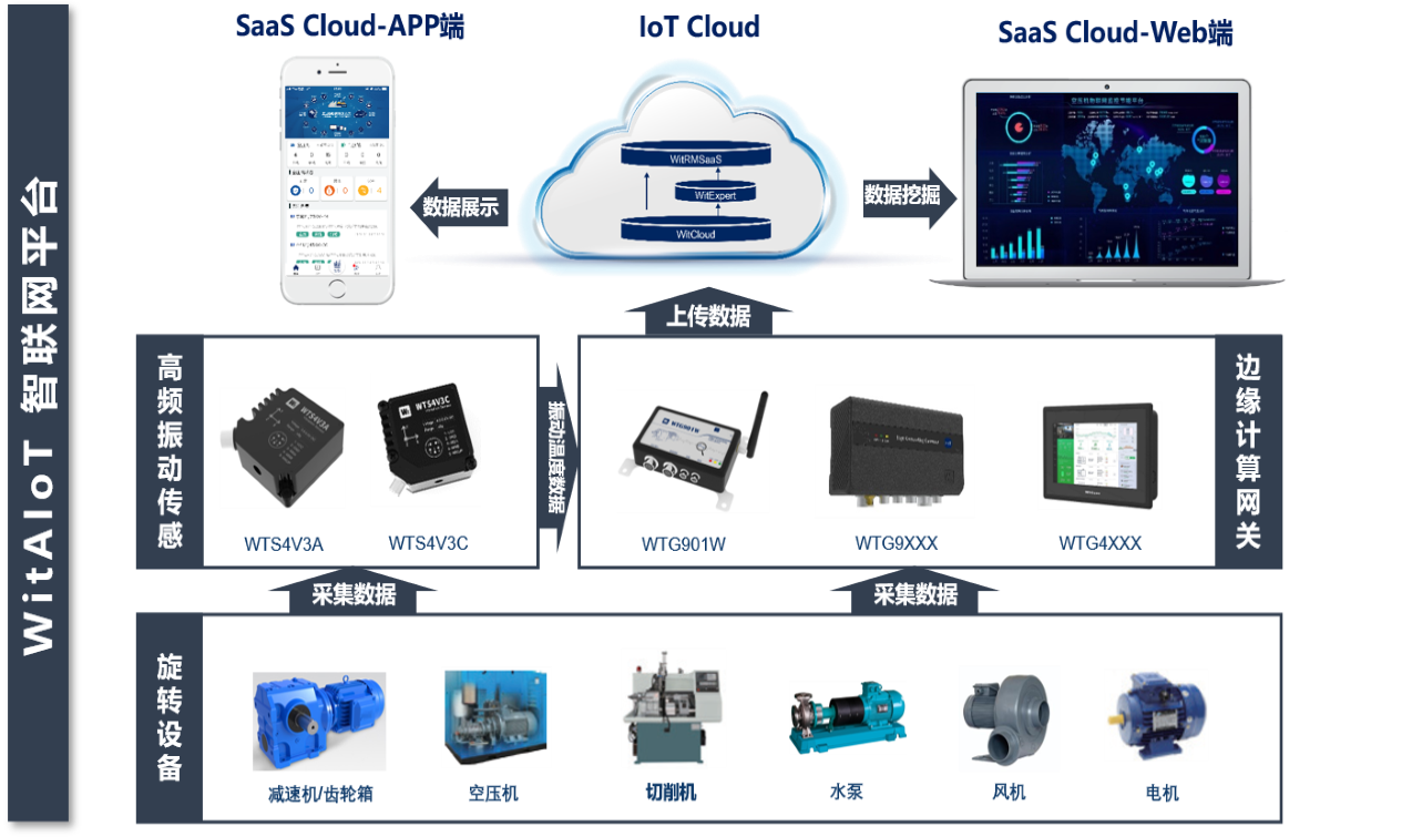 旋轉(zhuǎn)設備故障預測系統(tǒng)利用物聯(lián)網(wǎng)高頻振動傳感器,采集設備振動波形樣本及表面溫度,生成旋轉(zhuǎn)設備的振動特性樣本;WTG9XXX工業(yè)邊緣計算網(wǎng)關通過鉑電阻采集電機三相繞組溫度和潤滑油溫度,了解電機運行負載狀態(tài)并結合傳感器的振動特性,利用智能機理模型算法對采樣數(shù)據(jù)進行大數(shù)據(jù)分析,實現(xiàn)不平衡、不對中、松動、齒輪磨損、軸承老化等旋轉(zhuǎn)設備故障的預測;然后通過MQTT把數(shù)據(jù)樣本及分析學習結果上傳到WitCloud物聯(lián)網(wǎng)數(shù)據(jù)云平臺;系統(tǒng)的SaaS業(yè)務云平臺為用戶提供狀態(tài)監(jiān)控、場景監(jiān)控、故障管理、運維管理、設備管理、客戶管理、權限管理等功能;并提供數(shù)據(jù)接口功能,方便用戶把設備狀態(tài)導入到智能工廠運維平臺系統(tǒng)。同時業(yè)務云平臺通過大數(shù)據(jù)分析工具,為專業(yè)的用戶提供設備的運行狀態(tài)分析、預警故障分析,并形成專業(yè)的旋轉(zhuǎn)設備健康診斷報告和維修建議。