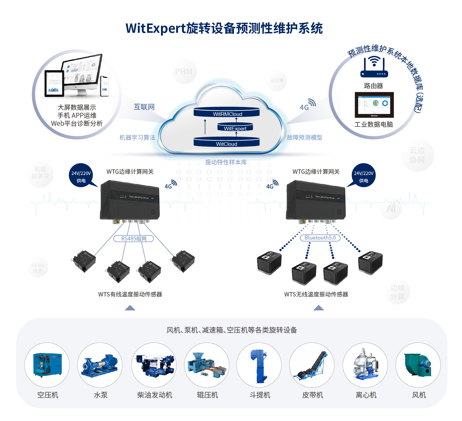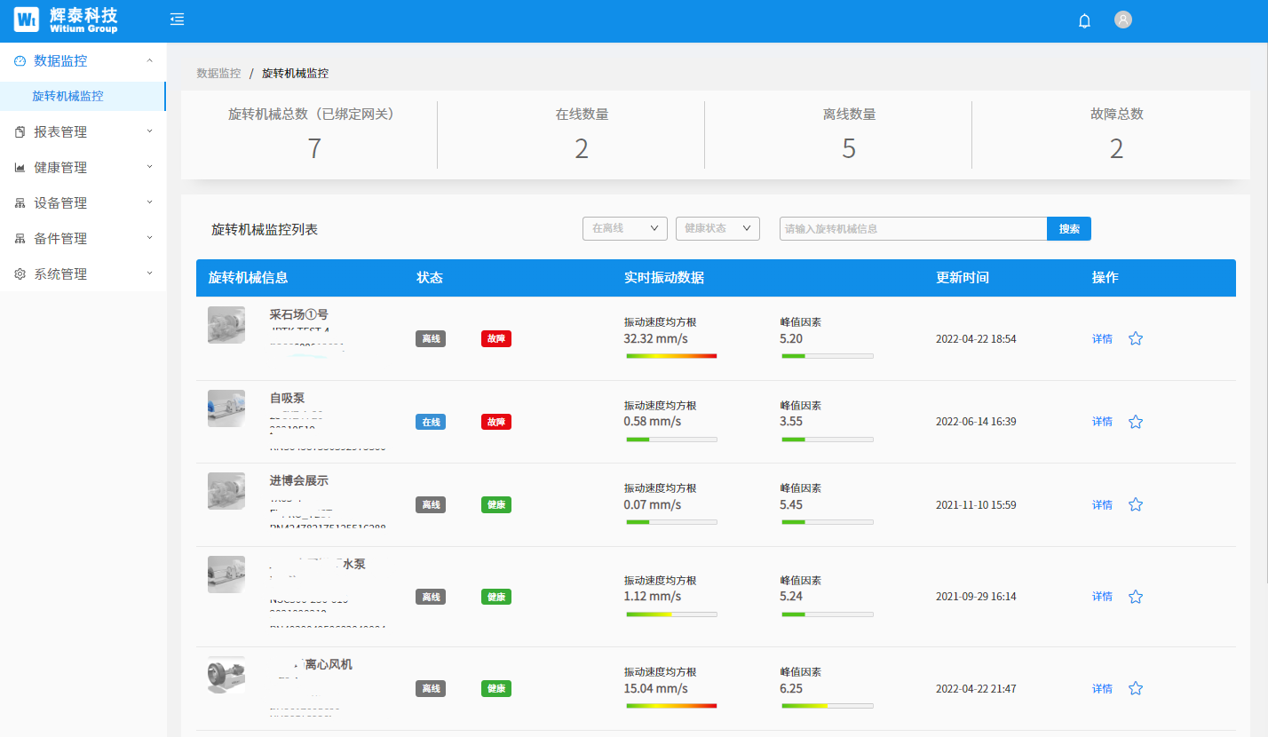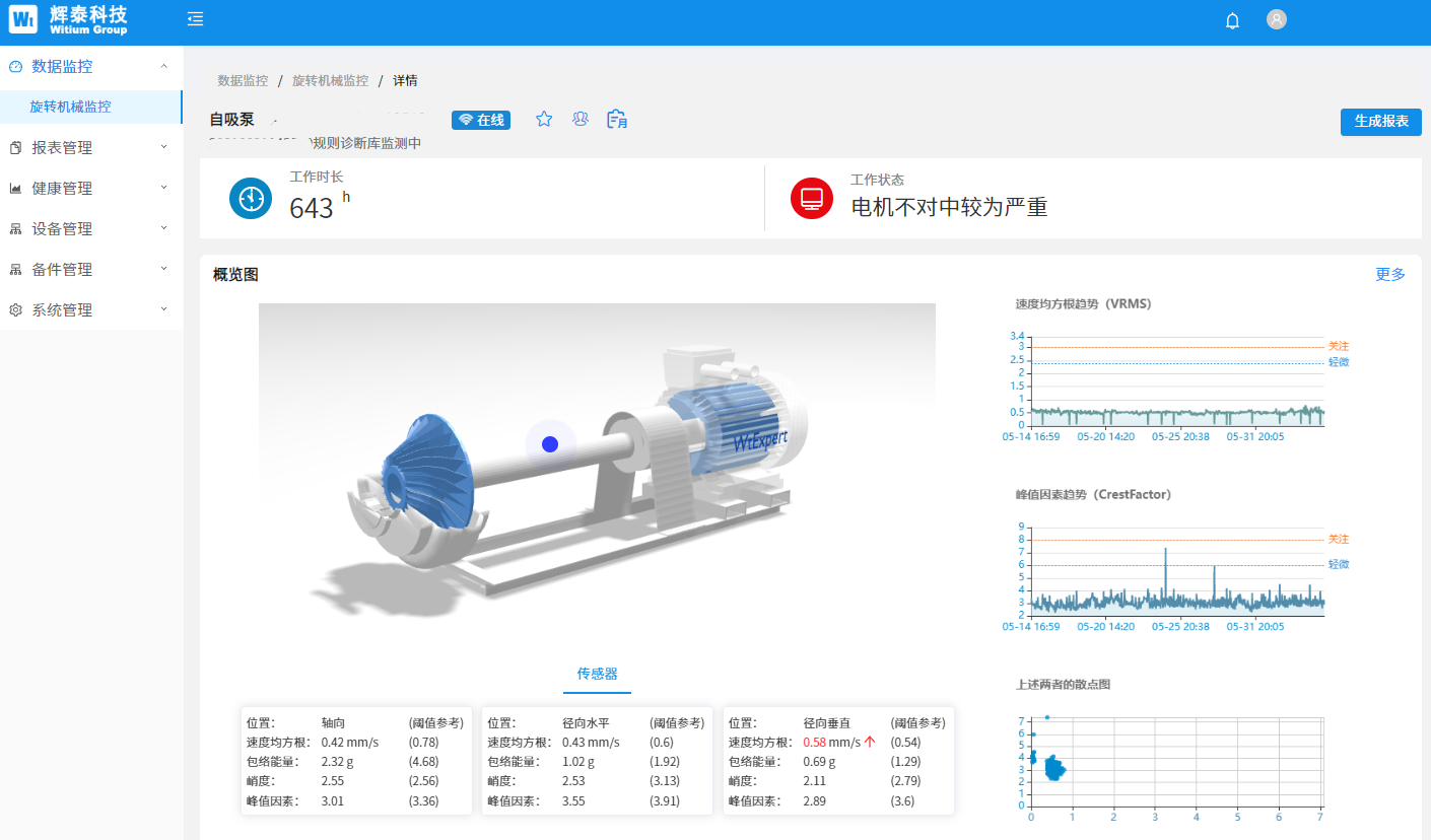 減速機故障預(yù)測解決方案利用物聯(lián)網(wǎng)高頻振動傳感器,采集設(shè)備振動波形樣本及表面溫度,生成減速機設(shè)備的振動特性樣本;邊緣計算網(wǎng)關(guān)通過鉑電阻采集減速機三相繞組溫度和潤滑油溫度,了解減速機運行負(fù)載狀態(tài)并結(jié)合傳感器的振動特性,利用智能機理模型算法對采樣數(shù)據(jù)進行大數(shù)據(jù)分析,實現(xiàn)不平衡、不對中、松動、齒輪磨損、軸承老化等減速機設(shè)備故障的預(yù)測;然后通過MQTT把數(shù)據(jù)樣本及分析學(xué)習(xí)結(jié)果上傳到WitCloud物聯(lián)網(wǎng)數(shù)據(jù)云平臺;解決方案的SaaS業(yè)務(wù)云平臺為用戶提供狀態(tài)監(jiān)控、場景監(jiān)控、故障管理、運維管理、設(shè)備管理、客戶管理、權(quán)限管理等功能;并提供數(shù)據(jù)接口功能,方便用戶把設(shè)備狀態(tài)導(dǎo)入到智能工廠運維平臺系統(tǒng)。同時業(yè)務(wù)云平臺通過大數(shù)據(jù)分析工具,為專業(yè)的用戶提供減速機設(shè)備的運行狀態(tài)分析、預(yù)警故障分析,并形成專業(yè)的減速機設(shè)備健康診斷報告和維修建議。